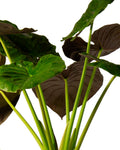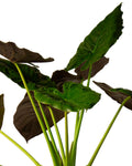 Alocasia Wentii is an impressive plant with wonderful foot long large deep ruby and crimson leaves that arch over gracefully from tall long stems.