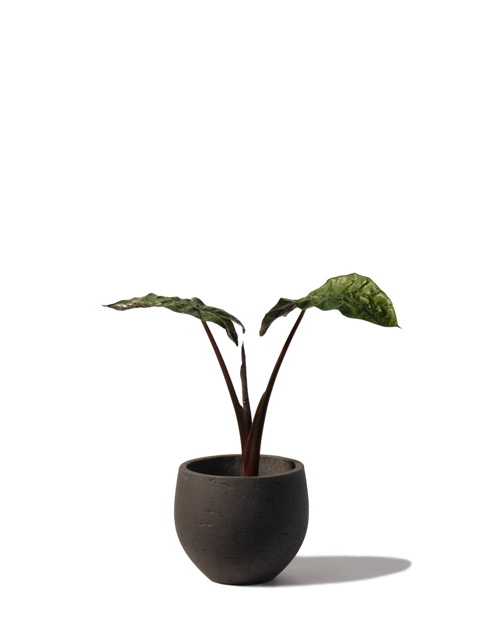 Alocasia Yucatan Princess boasts dark purple forest leaves on high sturdy long red velvety stalks. The leaves feature a rippled texture and grey-purple undersides.