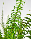 The Boston fern has sword-shaped, green foliage that contains tiny leaflets and grows erect only beginning to arch when fronds grow larger.