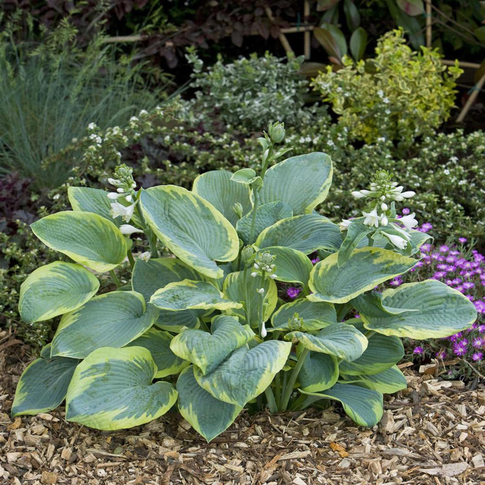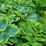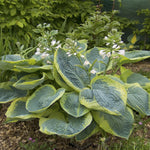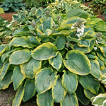 Hosta Frances Williams is a stunning shade-loving perennial with broad, blue-green leaves edged in golden yellow. It thrives in low-light conditions and provides excellent ground cover. Slug-resistant and easy to care for, it returns year after year. Delicate lavender flowers bloom in summer. Supplied in a 17cm pot, ready to plant.