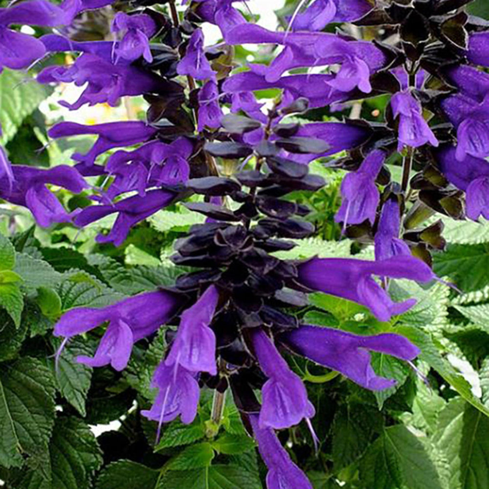 Salvia 'Amistad' is a striking perennial plant known for its lush, dark green foliage and vibrant, deep purple flowers with near-black calyces. Blooming from late spring to frost, this eye-catching plant attracts hummingbirds, butterflies, and bees, bringing life to any garden. Thriving in full sun to partial shade and well-drained soil, it reaches a mature height of 3-4 feet, making it perfect for borders, containers, and garden beds. 'Amistad' is drought-tolerant and low-maintenance, providing season-long color and dynamic visual interest. Its vigorous growth and unique blooms make it a standout choice for enhancing any landscape.