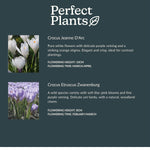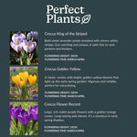 Bring a rainbow of spring color to your garden with the Perfect Plants Crocus 50 Bulb Gift Set! This collection features five spectacular Crocus varieties: Golden Yellow with its bright sunny blooms, Jeanne D'Arc in crisp, pure white, King of the Striped with bold red and yellow stripes, Etruscus Zwanenburg in elegant orange, and Flower Record in soft pastel tones. Each variety is packaged separately for easy planting and a premium presentation. Perfect for flower beds, borders, or containers, these Crocus create a stunning, colorful display that will delight gardeners and flower lovers alike.