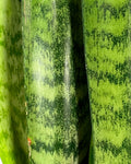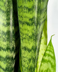 Sanseviiera Zeylanica has dark green sword like leaves with lighter green horizontal bands.