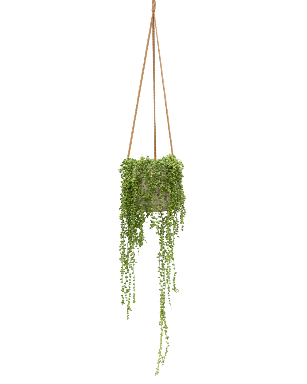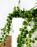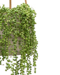 Senecio rowleyanus is an intriguing house plant that is also know as String of pearls or String of Beads due to its cascading pea-like beads. The trailing string although they look fragile are incredibly resiliant and create beautiful hanging displays. The plant is capable of flowering in spring and may produce white, daisy like flowers.