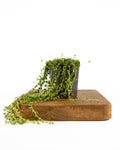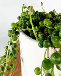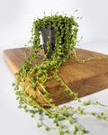 Senecio rowleyanus is an intriguing house plant that is also know as String of pearls or String of Beads due to its cascading pea-like beads. The trailing string although they look fragile are incredibly resiliant and create beautiful hanging displays. The plant is capable of flowering in spring and may produce white, daisy like flowers.