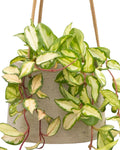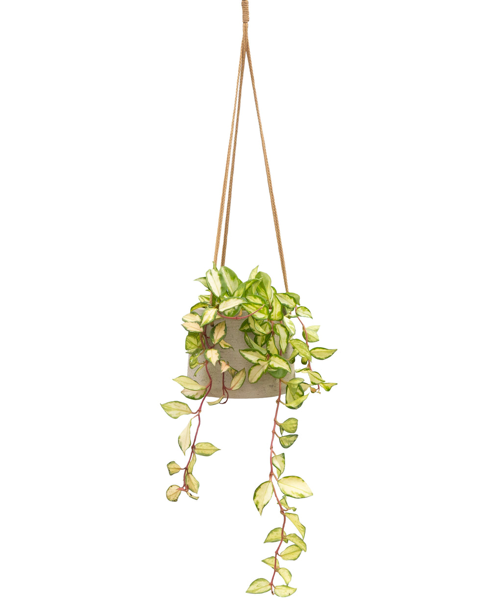 Hoya Carnosa 'Tricolor', is a great trailing or hanging house plant. It can eventually hang to about 1.2 metres or more. Hoya is a family of succulent vines and is otherwise known as a 'wax plant'. The leaves have a waxy coating which cuts down on water loss. Hoya are loved particularly for their fragrant flowers and this particular variety will eventually produce a cluster of ball-shaped pinkish white blooms, particularly when grown in a light spot. They tend to hang down rather like mini-umbrellas. They are highly perfumed and tend to scent the whole room!